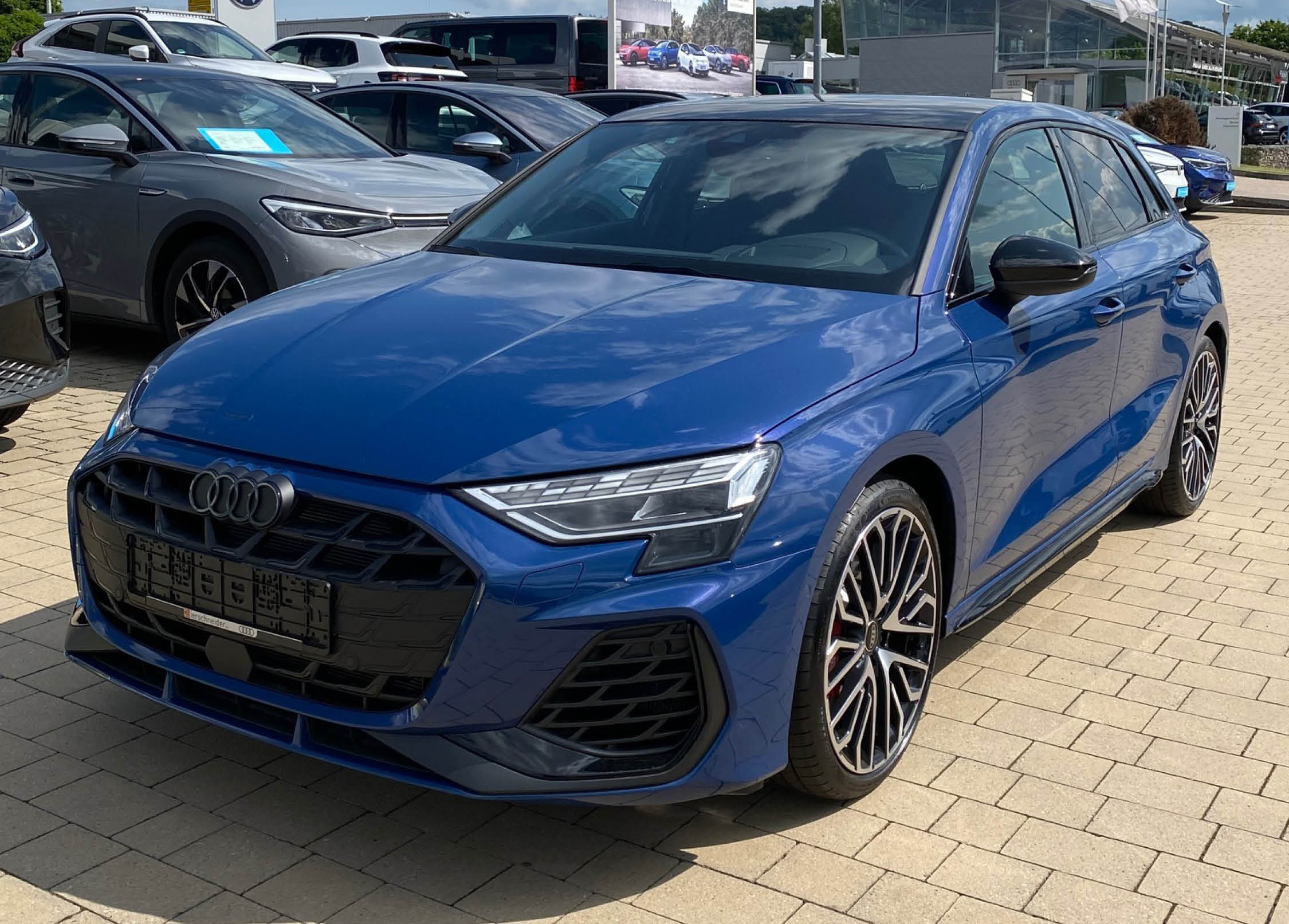 Ein Kunde freut sich über seinen neuen Audi S3 Sportback in Ascariblau. Der sportliche Kompakte bringt 333 PS auf die Straße und bietet dazu moderne Technik und ein angenehmes Fahrgefühl. Mit seinem kräftigen Antrieb und dem praktischen Innenraum macht der S3 sowohl im Alltag als auch auf längeren Fahrten eine gute Figur.
